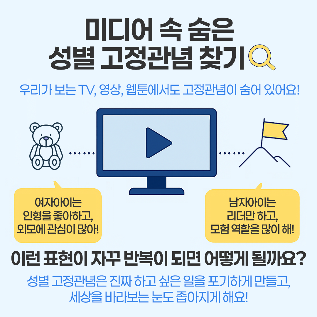 제작의도: 일상생활에서 접하는 다양한 미디어 속에 숨어있는 성별 고정관념을 살펴보고,
