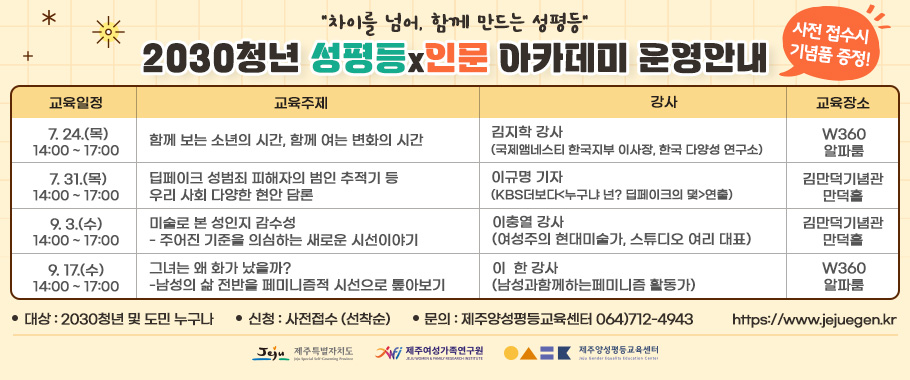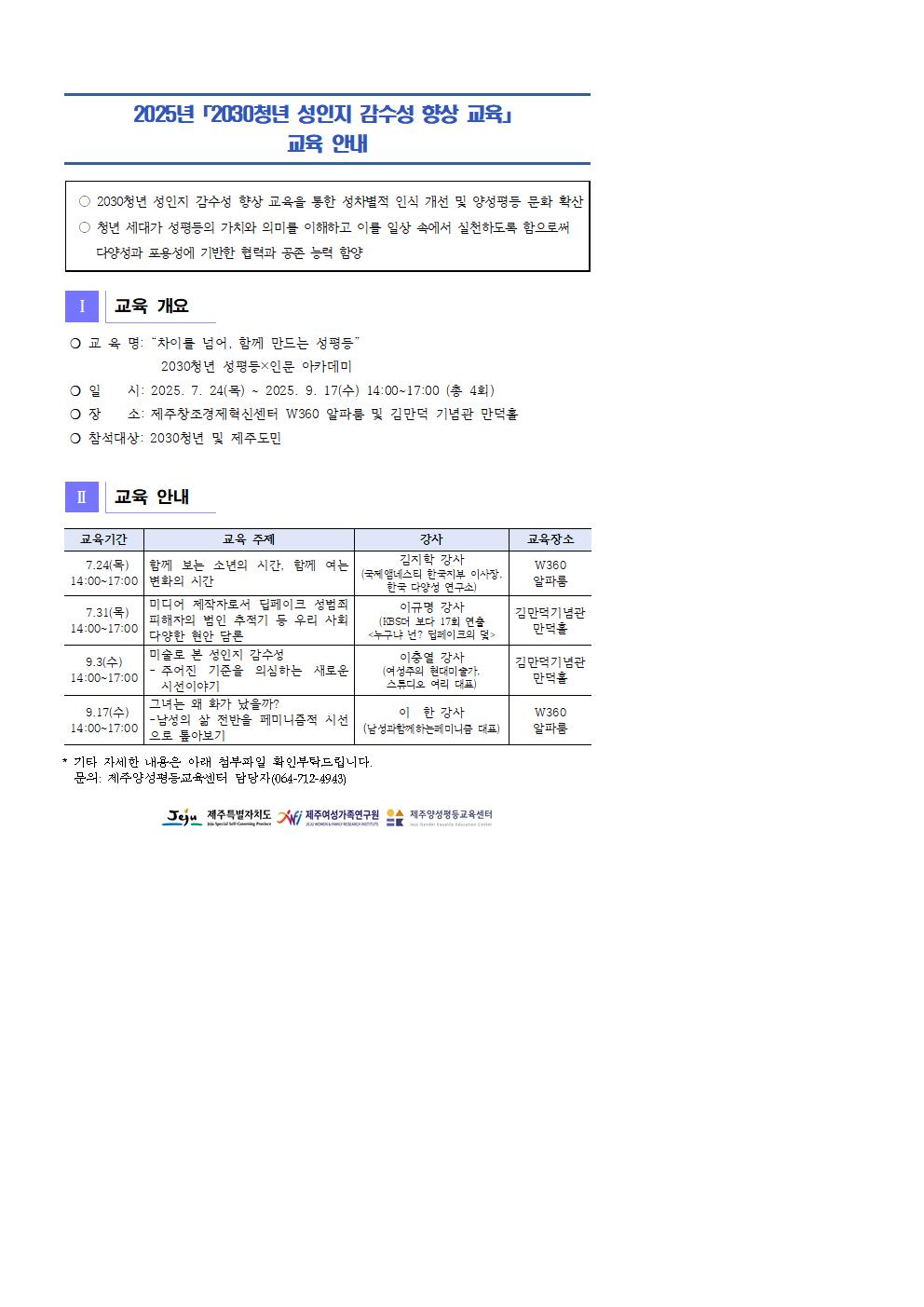 | 제목 | [제주양성평등교육센터 공고 2025-4호] 2025년 2030청년 성인지 감수성 향상교육_성평등×인문 아카데미 교육신청 안내 | ||
